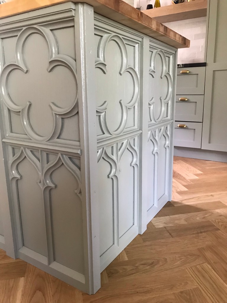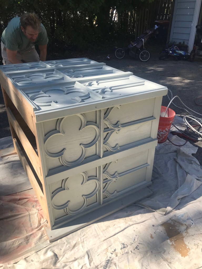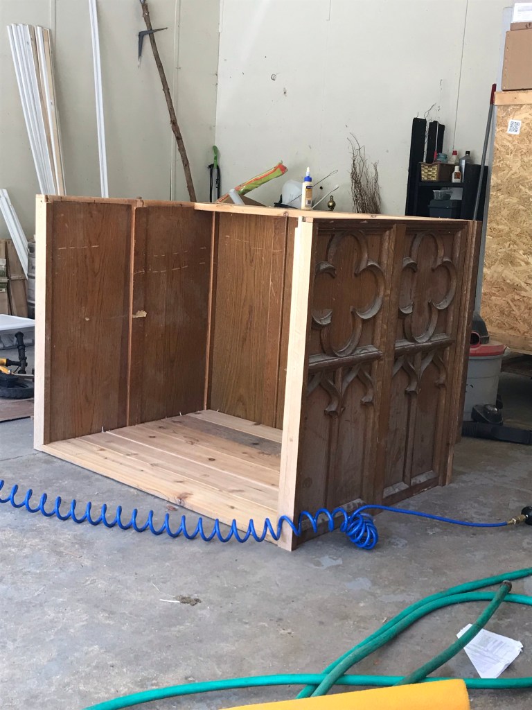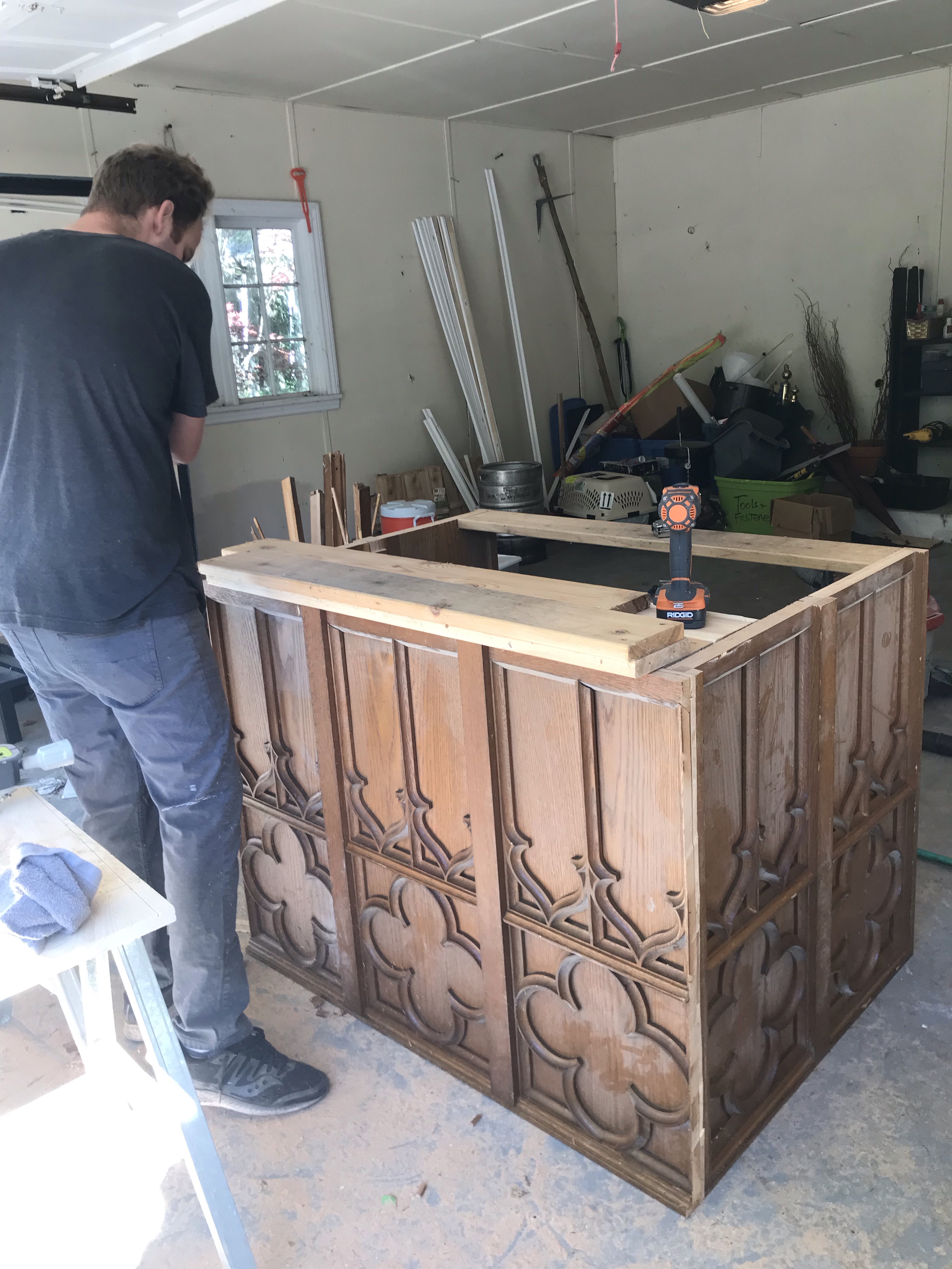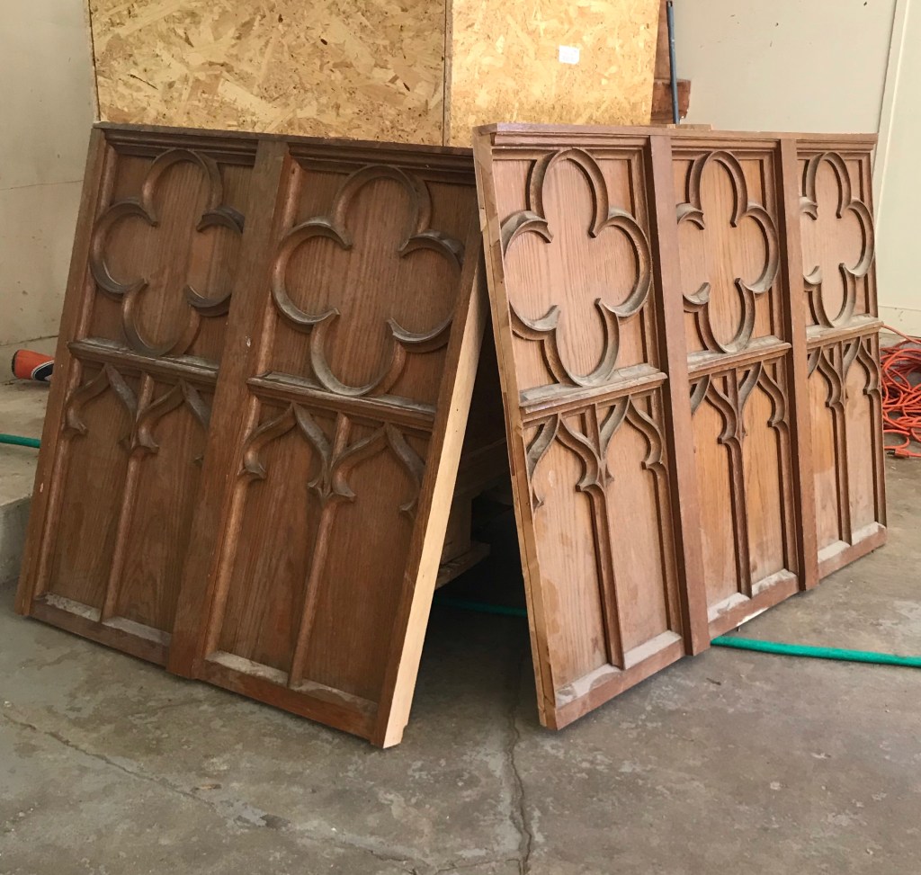 In 2013 we brought baby Emerson home from the hospital. It snowed all weekend, the roads were terrible and we were mostly stuck indoors. Somehow, Simeon had noticed the construction on the beautiful old church around the corner had begun. A developer was turning the nearly 100-year-old beauty into apartments, and these hand-carved panels just happened to be peeking out of the dumpster. Immediately we had a case of “one man’s trash is another‘s treasure”.
