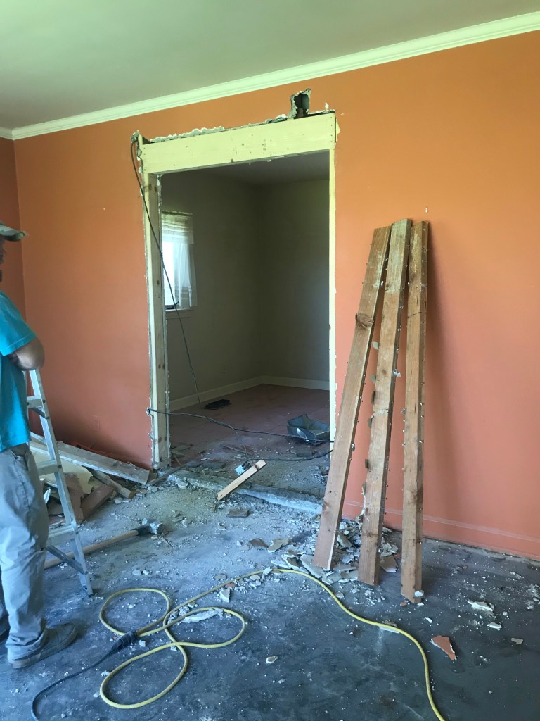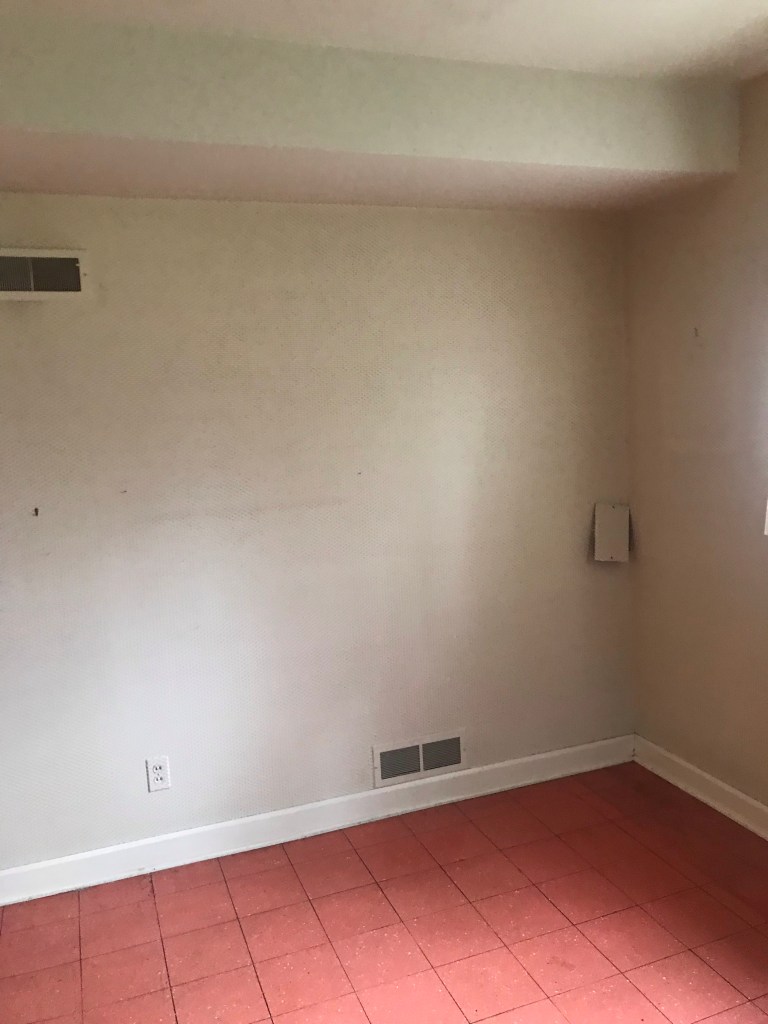 Blah. With it’s asbestos floors and papered walls, it felt like a cave. This little gem was tucked at the end of a long dark hallway, designed to be a guest bedroom (Clearly for your worst enemies who happened to be house guests). When thinking through any layout changes, we observed the room’s West wall backed up to our window filled living room. The natural solution? To punch a 50” opening in the wall to open the space to the living room and view.