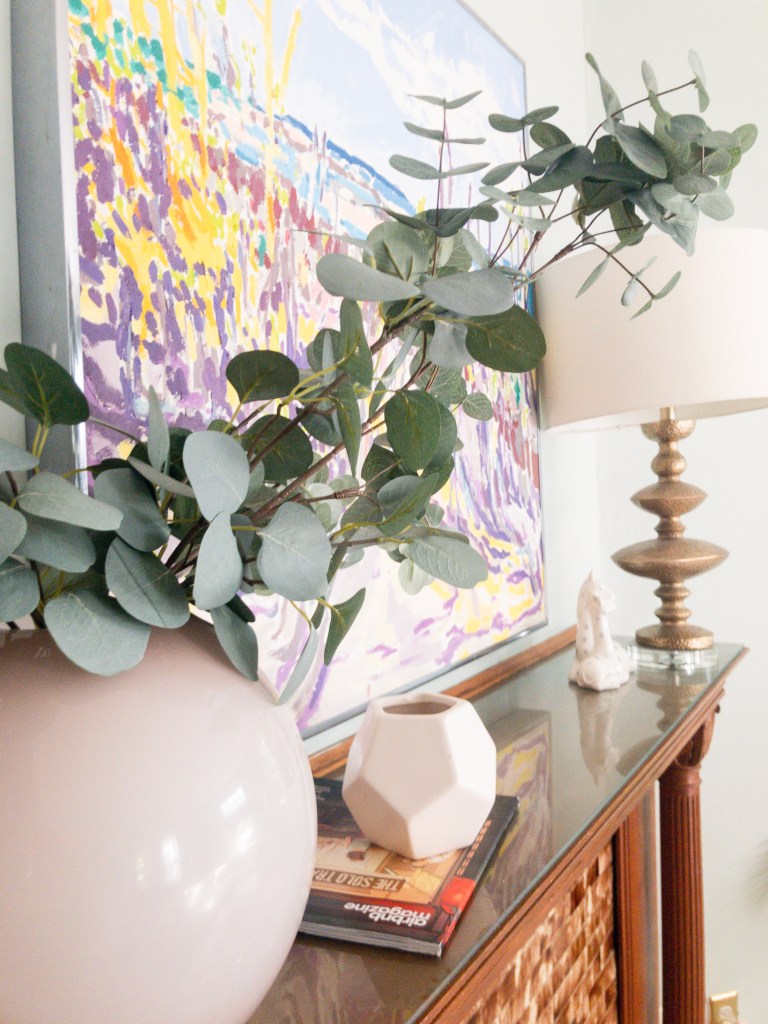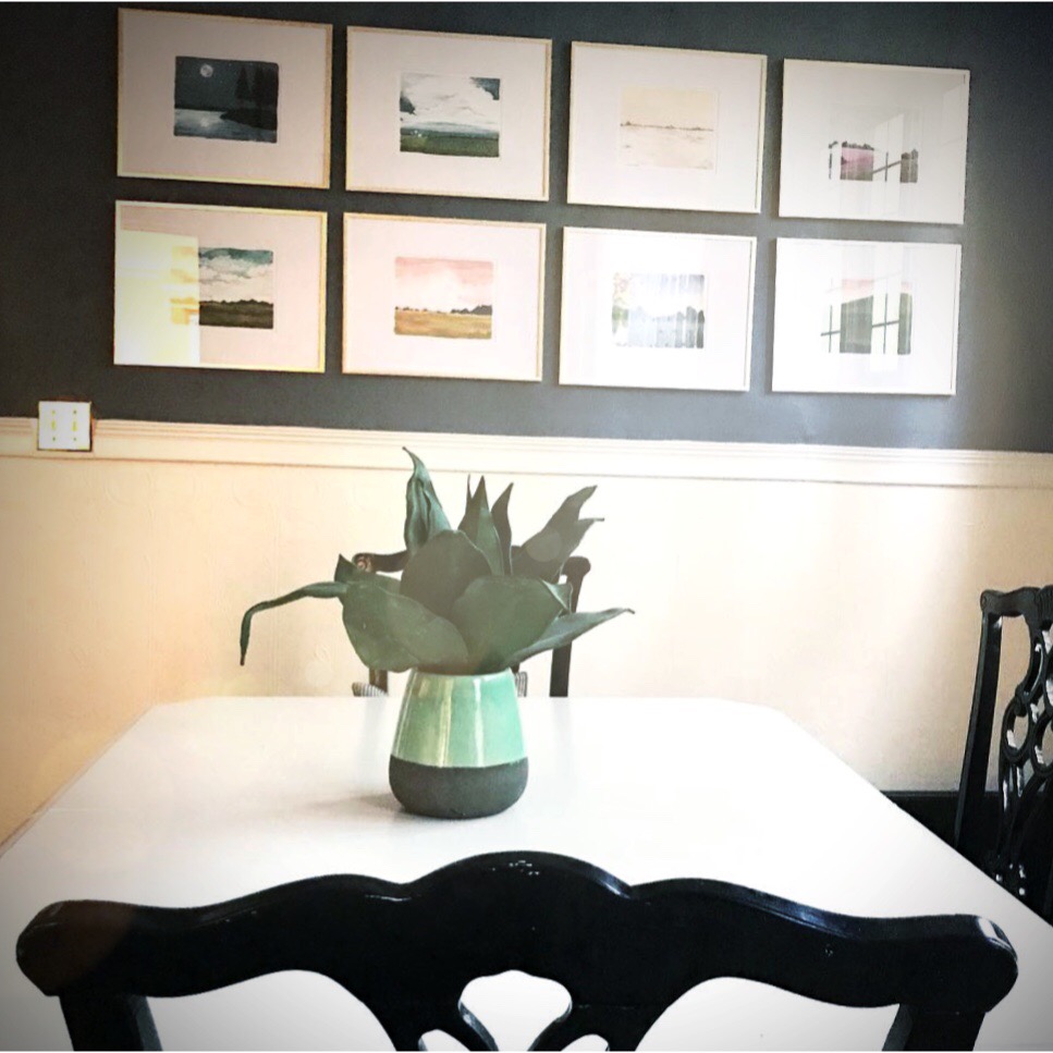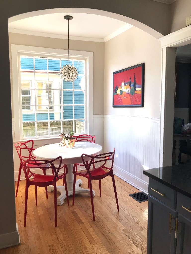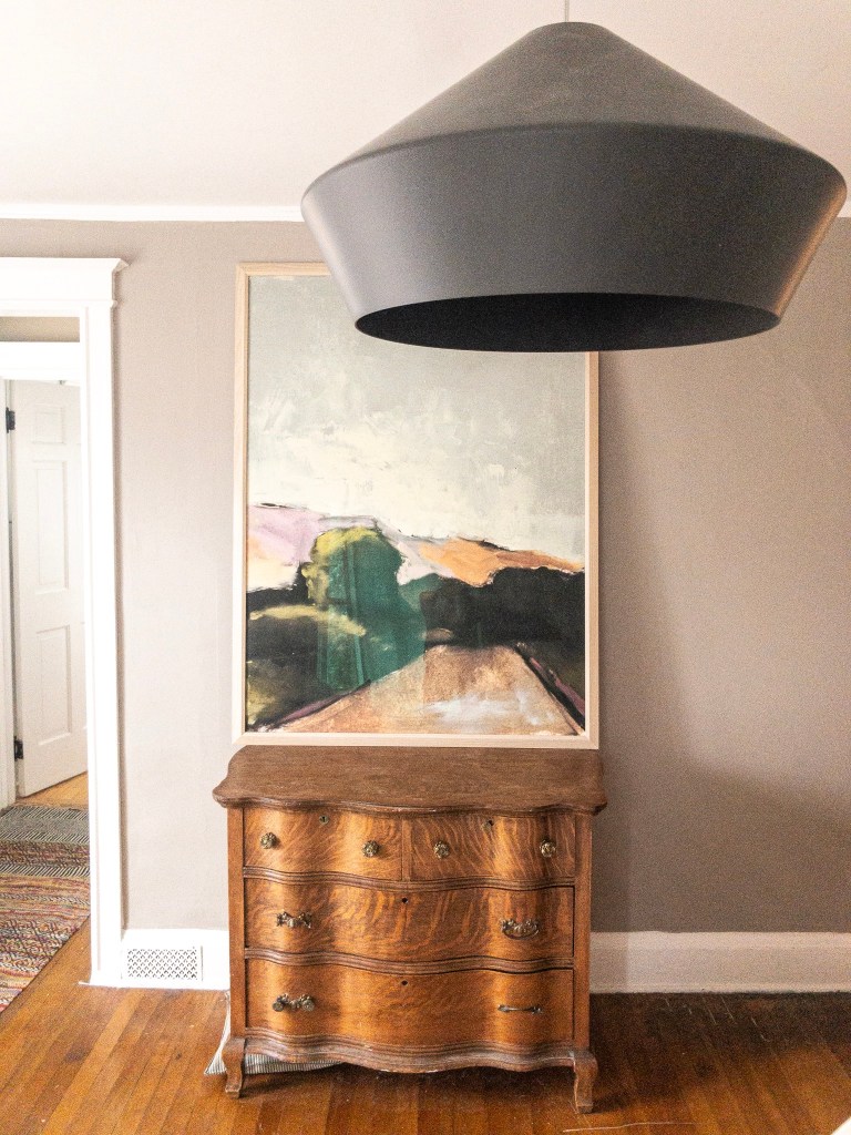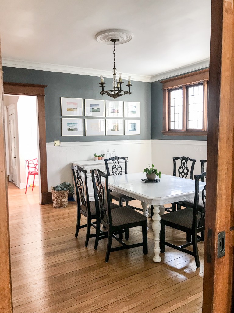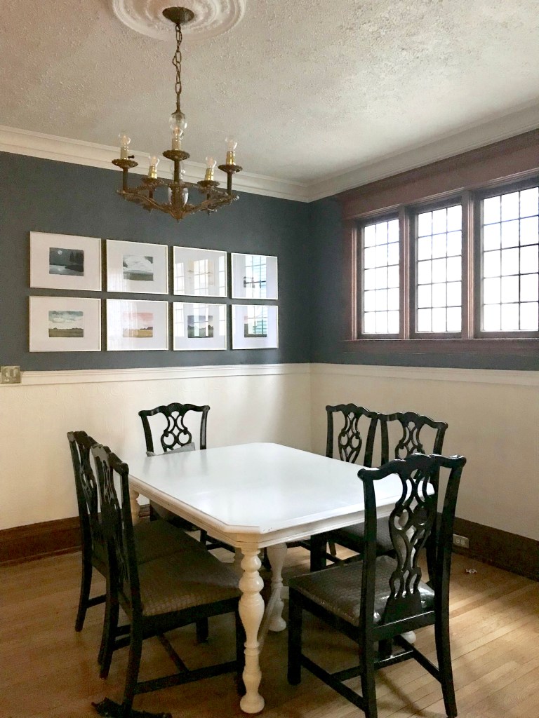 The pocket doors are the most notable attribute of this space. Solid oak, each door is nearly 3” thick, we had two: one between the dining room and entry way and one between the dining and living room. They rolled like a charm and functionally were awesome. If we had dinner guests and the kids were watching a movie, zip…separate rooms. Every piece in this space is second hand. The table I found for $80 on Craigslist and painted it. The chairs – which are beautiful black lacquer, I found for $180 (set of 6) and the credenza, hardly visible under the gallery wall, I purchased to convert into a vanity but ended up using it in the dining room. Furniture grand total: roughly $360 PLUS paint.