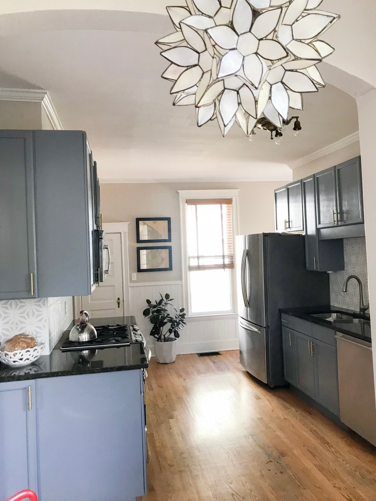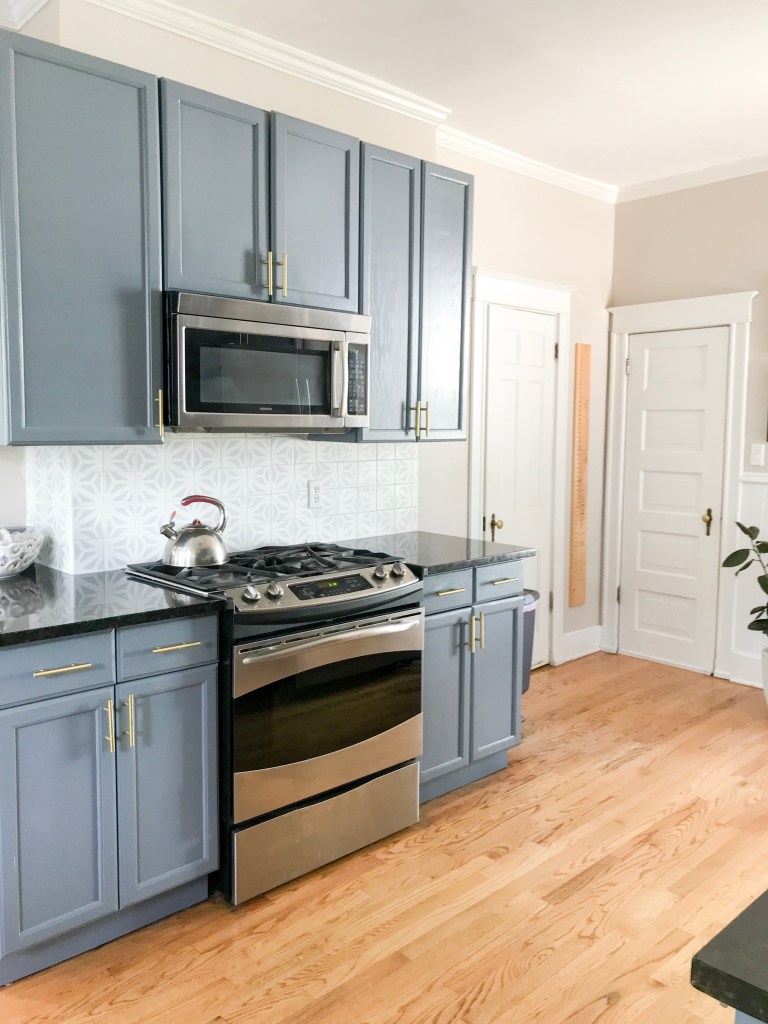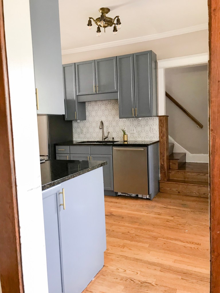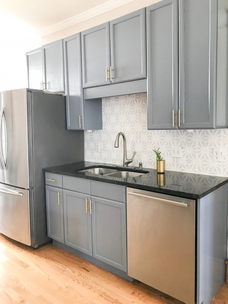 The back-splash is a whole other post (literally, you read about the process here). I fell in love with a cement tile in a pattern and color combination called catalonia gray. Each tile ran $7.40/each, and I know myself well enough to realize I’m attracted to loud designs that I will likely want to change in the next five years. What better time than to try my hand at stenciling? So, in came $0.20 tiles and tile paint (before I drag you into the details, see sister post).