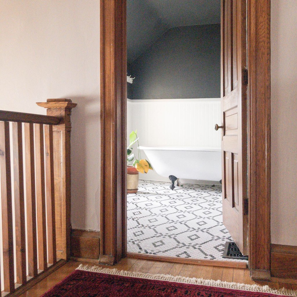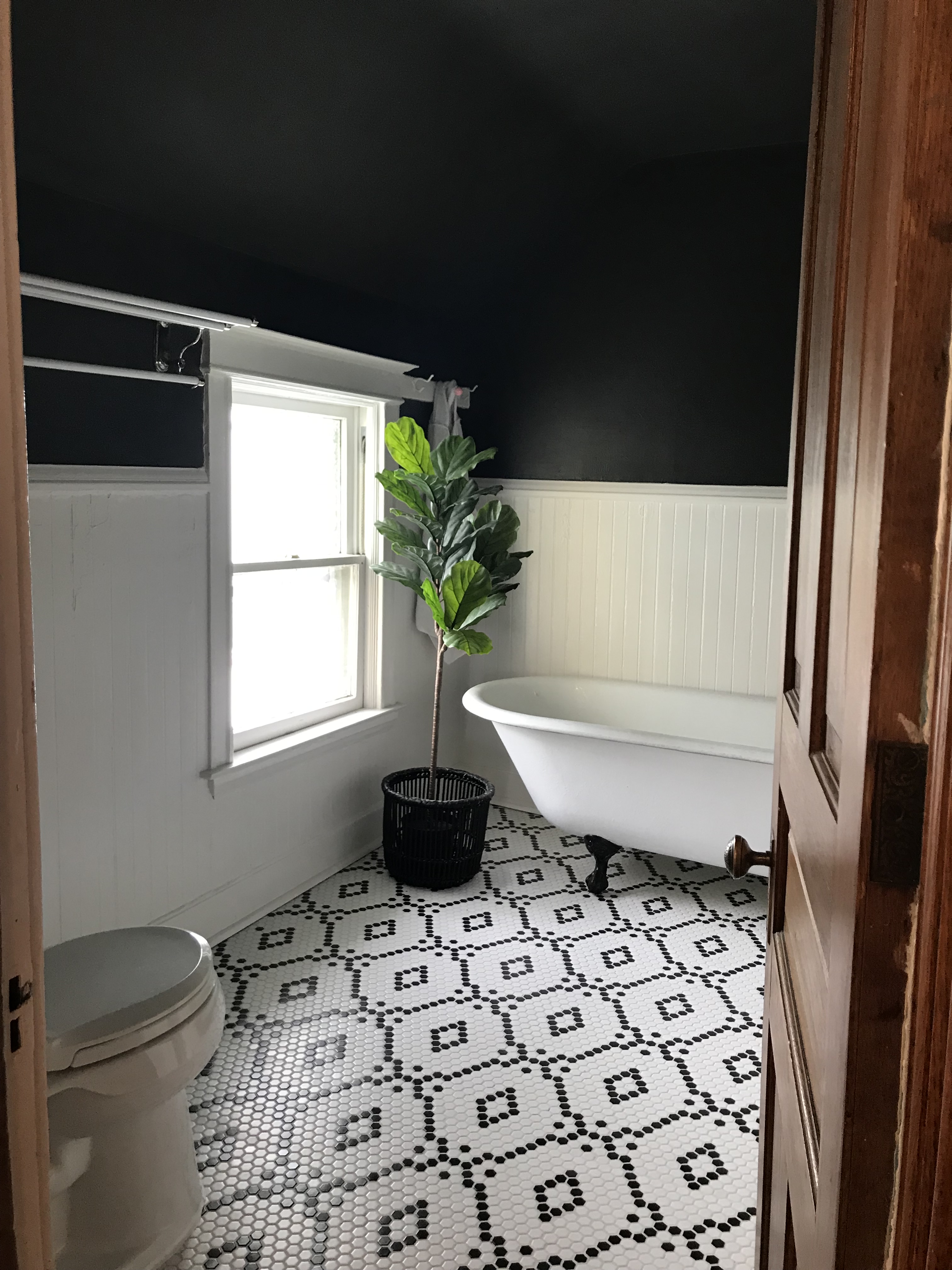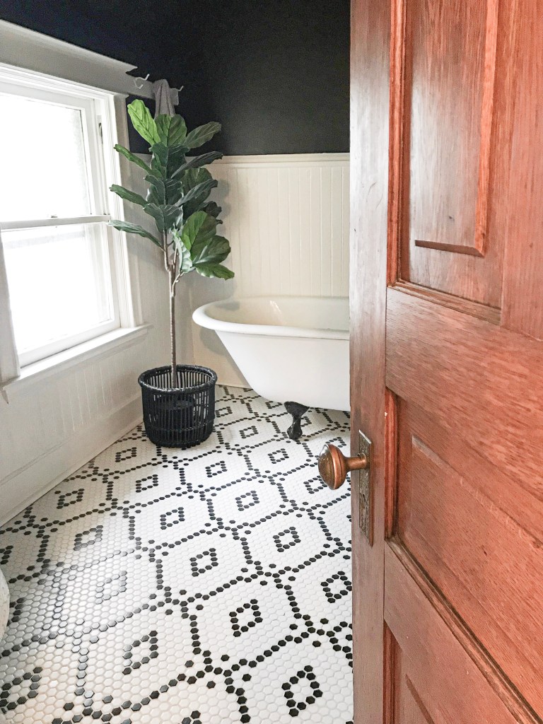 This was one of my favorite transformations in the house. The floor was a beige and brown basic tile that was poorly laid, however the walls still had the original wainscot. Knowing I wanted to stay true to the era of the house, but also acknowledge my bend toward the eye-catching, I settled on traditional 1″ hex tile. I bought 12×12 sheets of white and black tile from the Tile Shop. Here’s where it gets tedious: Once I determined my design. the repeat wasn’t every 12″ – meaning every sheet wasn’t the same. So I would lay out several sheets at once and with a sharpie, I would X out the hex tiles that needed to be punched out of the mesh and replace it via glue gun with a black hex tile.
