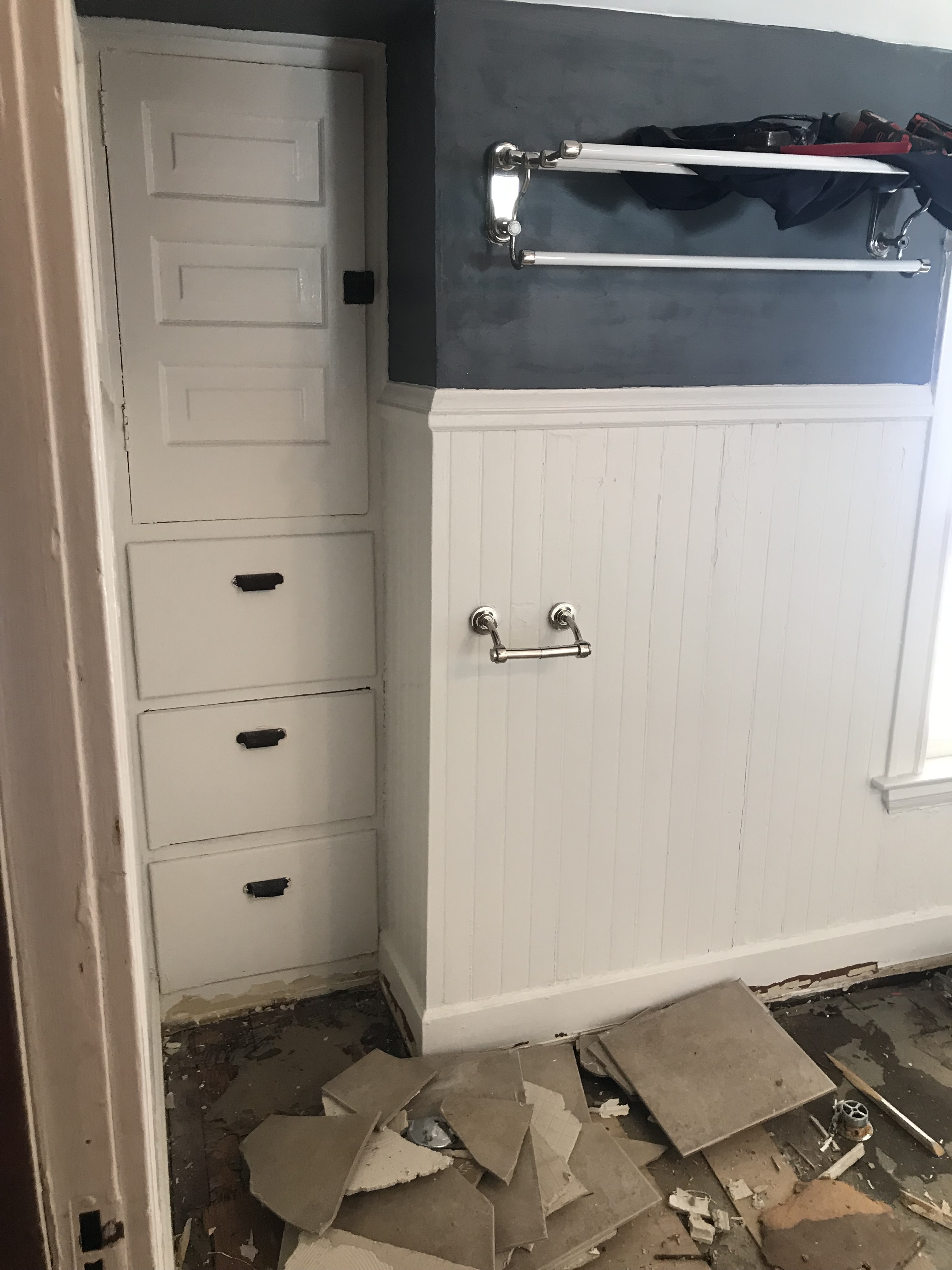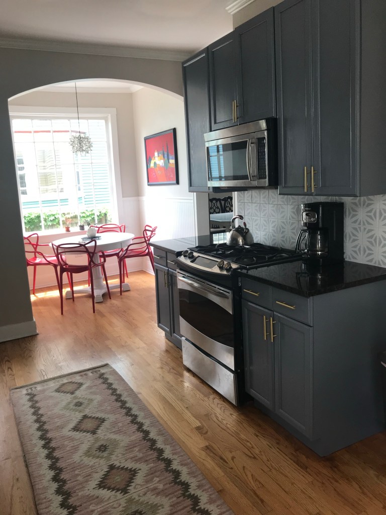 The cabinets and floors were in good shape, but the colors were bad. I painted all the bead board Sherwin Williams Snowbound, along with the trim. The walls are Sherwin Williams Realistic Beige – but don’t let the name throw you – the color has a purple undertone and neither looks definitively beige or gray. It’s a mystery color. We actually used this color in the front entry way and brought it up the stairs to the second floor landing and hall, and back down the back stairwell. Full circle with Realist Beige. The cabinets are Sherwin Williams Wolf Grey.