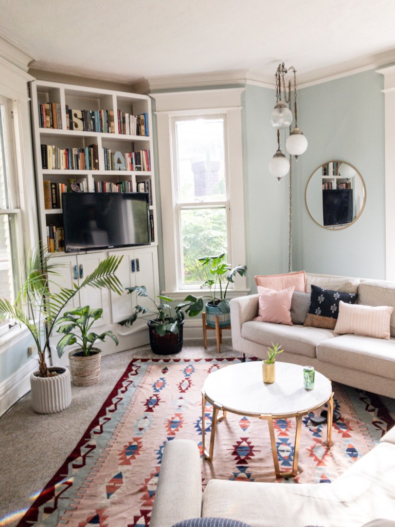 The living room was my favorite room for one simple reason. THE LIGHT. Oh you guys, the light that filtered into this southwest facing room was beautiful, it felt like you were living in a southern California photo shoot on even the cloudiest of February afternoons. We ended up touching everything but the windows in this space. We had the ceilings skim coated, replaced the carpet with the tan herringbone carpet (pictured at the bottom the post, the old carpet is still featured in most of these photos). I found the white cabinet from a discount store, the Geode pulls from Hobby Lobby of all places. Simeon mounted the cabinet to the wall and built in the bookshelf and base around it. We never like the look of a TV being the most promenade space in the living room, but the layout left us little choice. So compromise, we mounted the tv over the bookshelf.