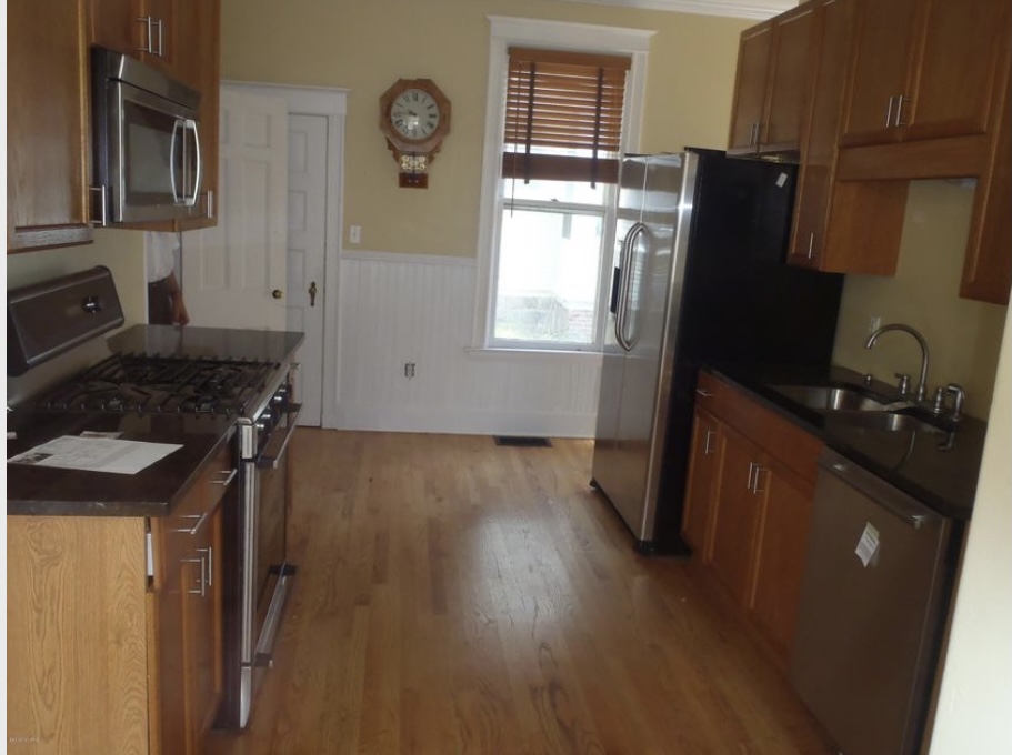 The kitchen, when we started, looked a little more like the photo pictured below right. The back stairwell was closed behind the wall and the stairs went to the outside (not the original layout of the house). We opened up the wall and twisted the stairwell back into the kitchen.